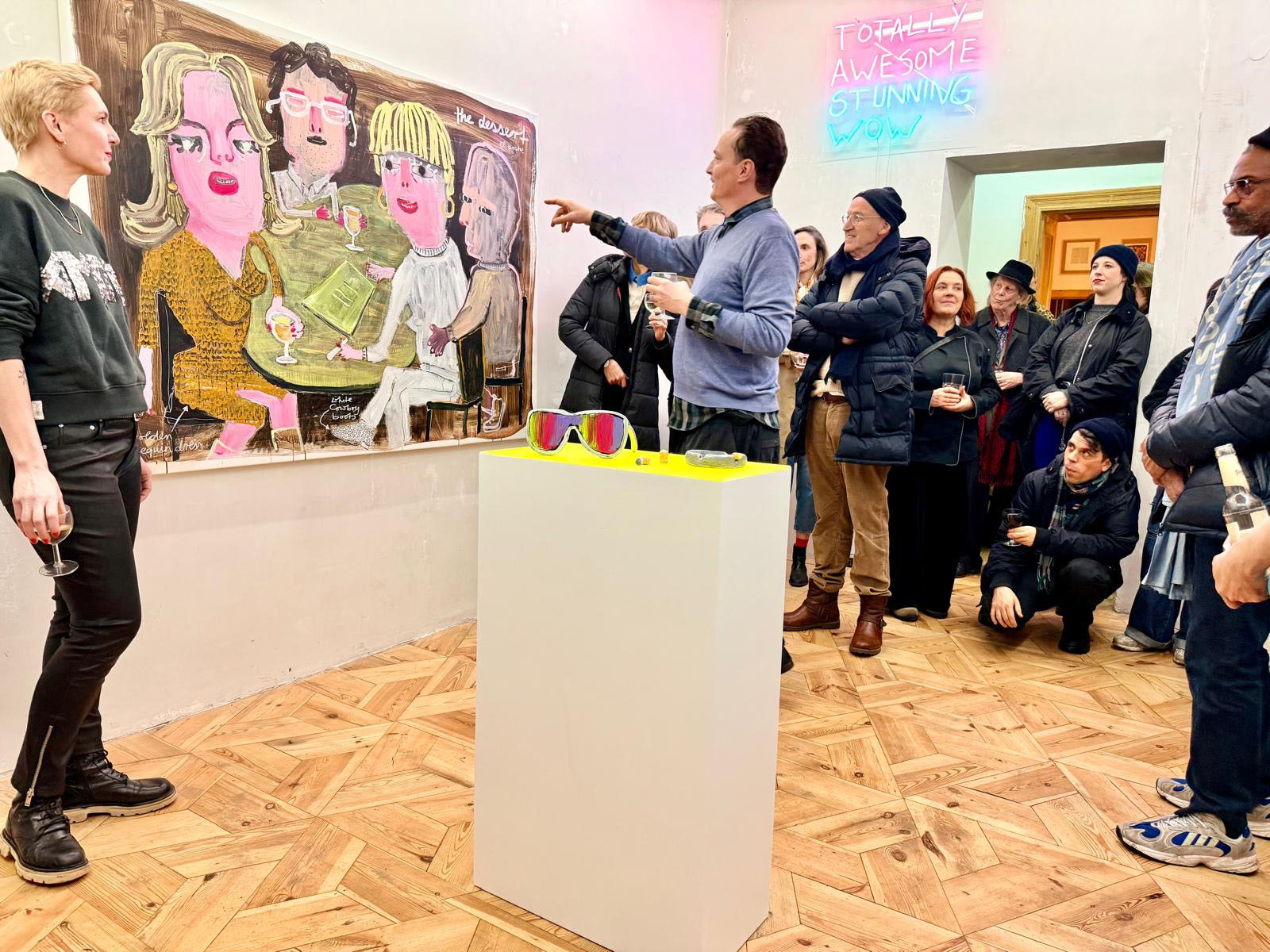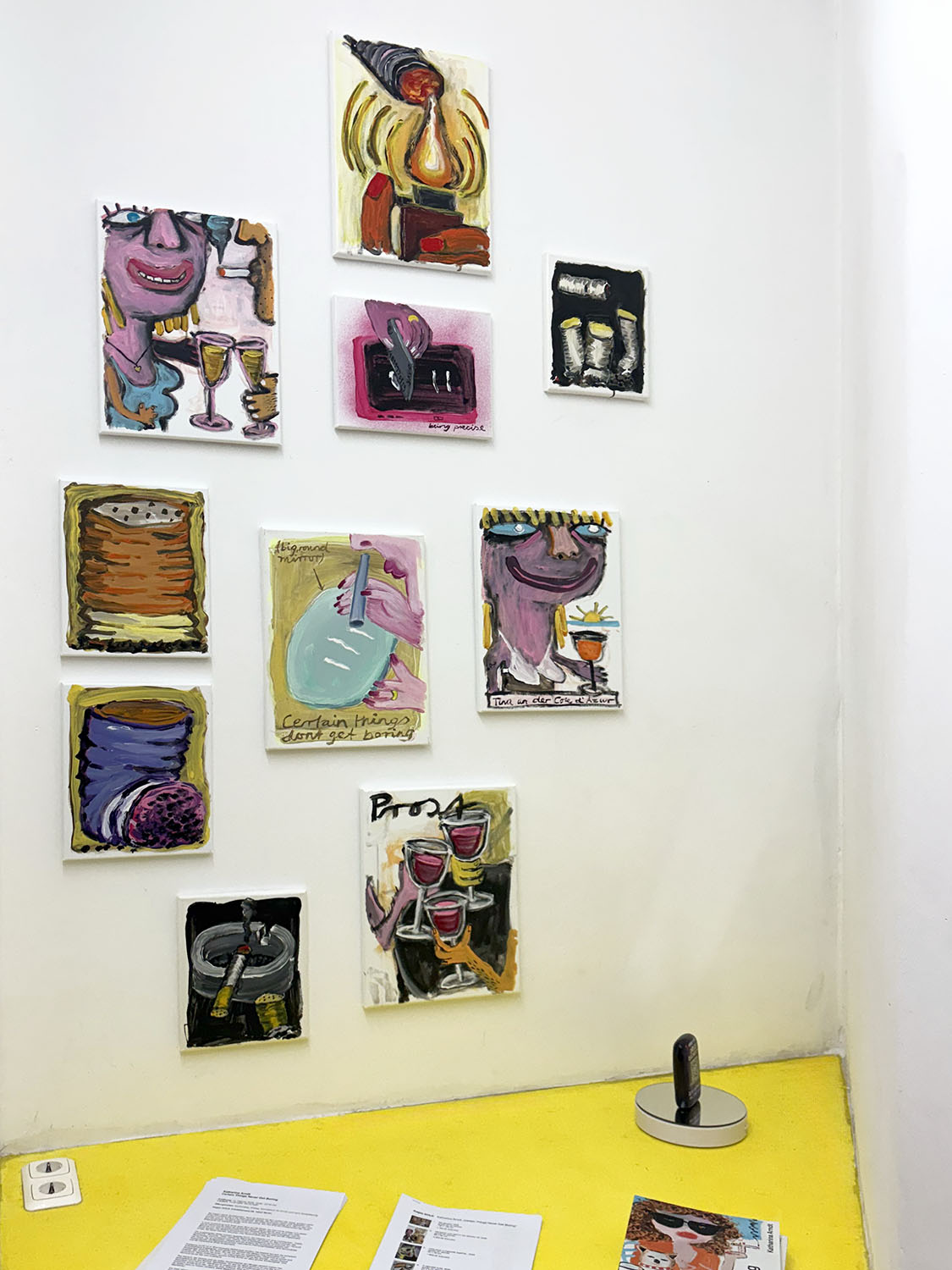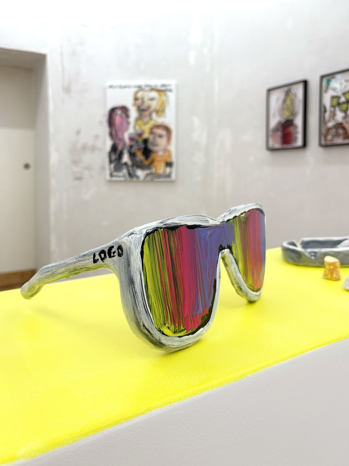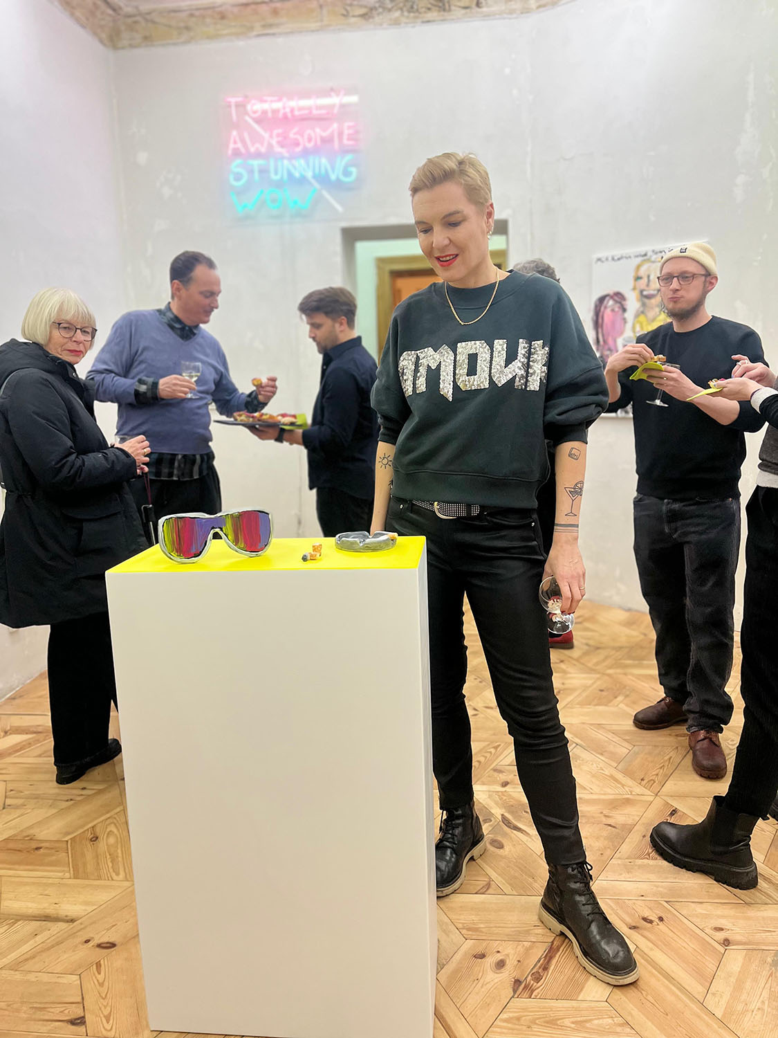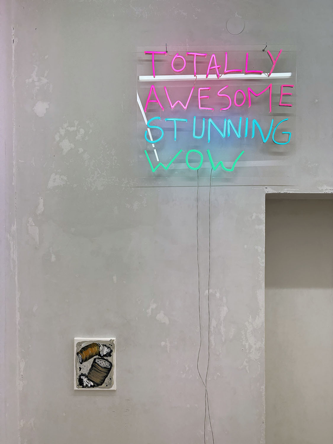 Die ausgestellten Bilder werden begleitet durch vier Objekte und eine Leuchtschrift. „Totally Awesome – Stunning – Wow“ strahlt die Besuchenden als erstes an. Das Lustvolle, das Rauschhafte und Exzessive sind Thema. Das Außeralltägliche als Kontrapunkt zur Vernunft die These. Die ausgestellten Objekte sind als Essenz der Ausstellung gesetzt: Ein Aschenbecher mit Zigarettenstummeln, betrunkene Champagnergläser, eine Sonnenbrille und die Visitenkarte eines Drogentaxis.