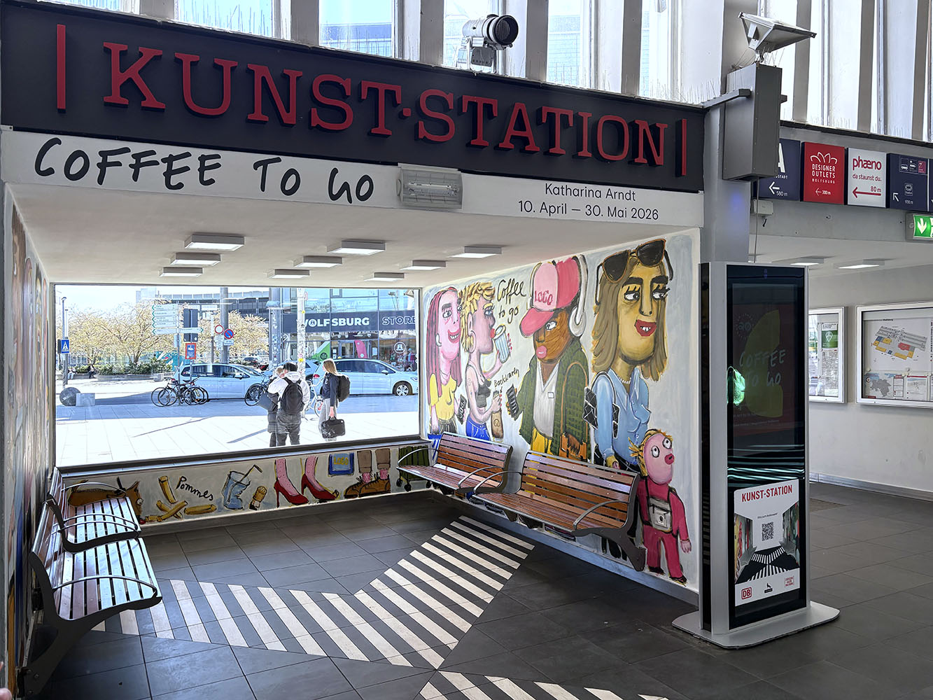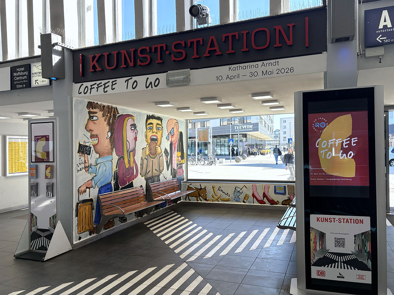 Katharina Arndt ist eine genaue Beobachterin des Alltags — eine Situationsporträtistin unserer Gegenwart. Mit ›Coffee to Go‹ setzt die Künstlerin den Auftakt zum Jubiläumsjahr 20 Jahre Kunst-Station im Hauptbahnhof Wolfsburg, einem Ort voller Hauptfiguren, Nebendarsteller✺innen, Begegnungen und Geschichten.
