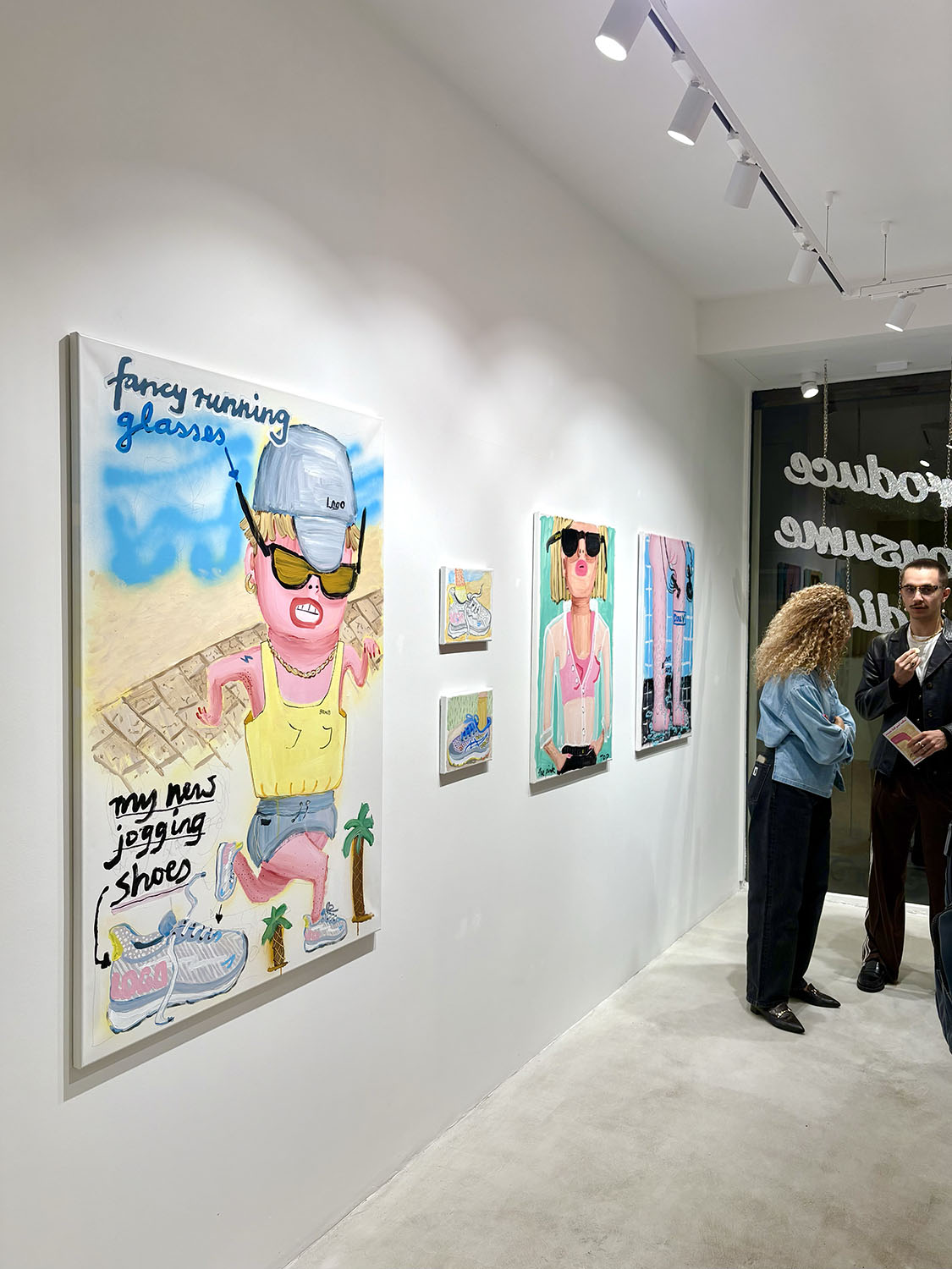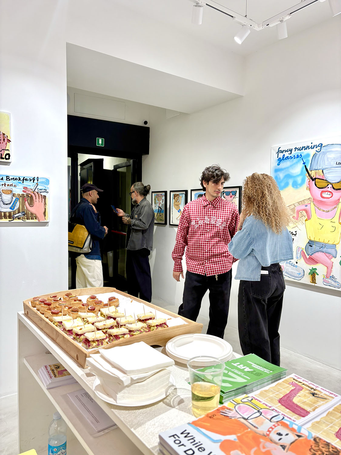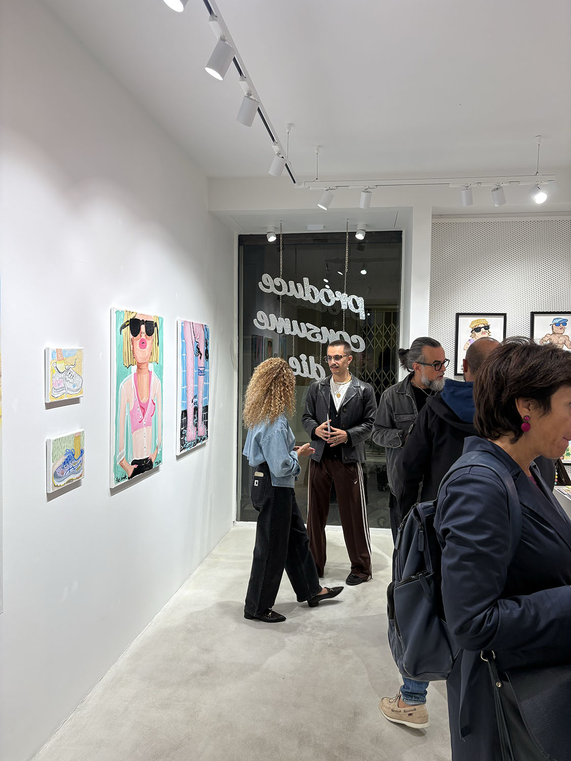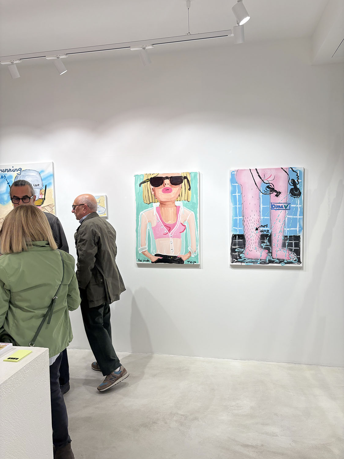 With a deliberately fast pictorial language, the artist reflects on the naivety with which people seek escape and recognition, transforming ordinary moments into a “social” spectacle, often far removed from reality.
