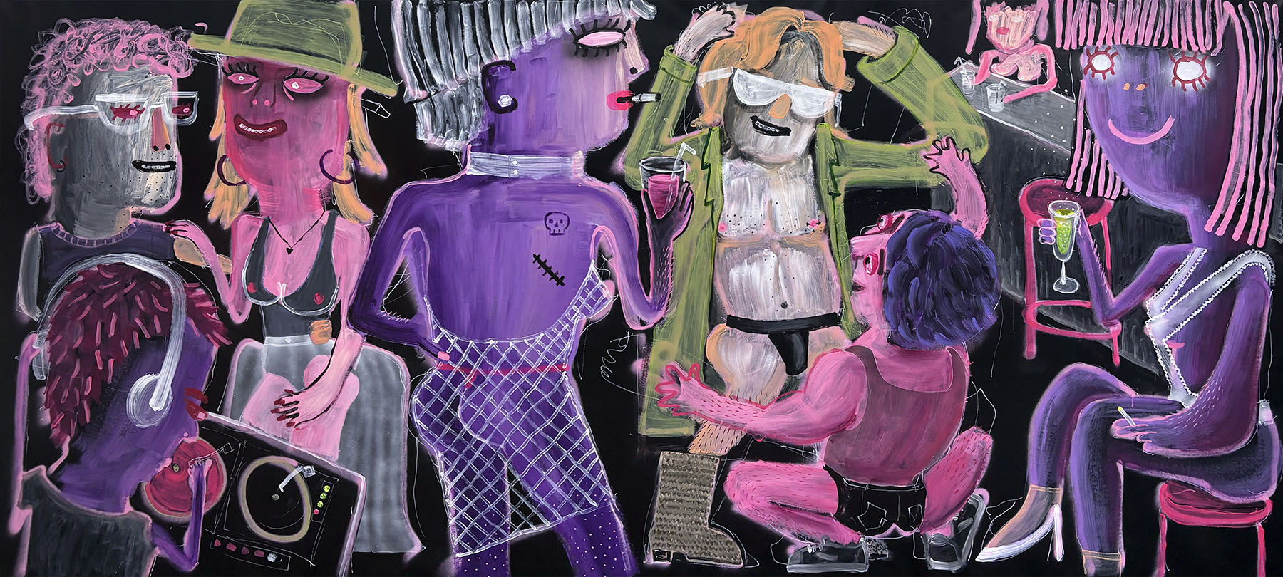 Close Back to Portfolio at KitKatClub Januar 19, 2026 2025, 180 × 400 cm, acrylic, spraypaint and marker on canvas Permalink painting Previous