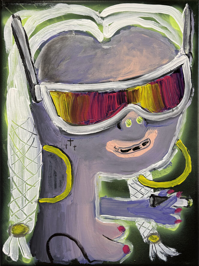 Close Back to Portfolio I wear Sunglasses at Night. Januar 19, 2026 2025, 40 × 30 cm, acrylic, spraypaint and marker on canvas Permalink painting PreviousNext